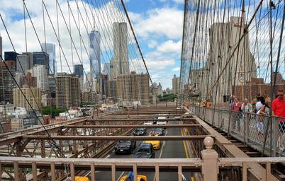 Keywords: bridge sun manhattan brooklyn new york architecture downtown view skyscraper york city building skyline sky blue clouds town tourism construction