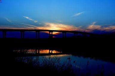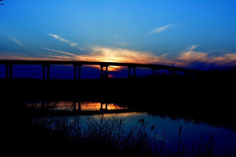 Keywords: bridge sunset water shadow sun in the evening red cloud