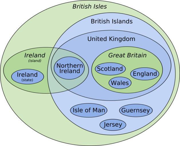 | Keywords: British Isles Euler diagram 15.svg en Euler diagram of the British Isles aac2ed Legal distinctions b1d79b Geographical features 50px Consensus This diagram was developed by consensus Before modifying it please read the full discussion archive If you still want to change it please first discuss your proposed changes at the talk page on Wikipedia own TWCarlson Cc-zero Also Ireland state is more parallel with Ireland island so it shows the difference clearly ; Why is Northern Ireland included under British Islands when it is not an island British Islands confusingly is a legal term that includes the entire U K as well as Isle of Man and the Channel Islands See en British Islands ; British Isles is offensive and biased toward the United Kingdom It should say Great Britain and Ireland or These Islands There is controversy surrounding the use of this term and its use is being discussed at en WP BITASK If something new comes out of that conversation this diagram would certainly be subject to the new terminology ; Why does the legend use legal instead of political This is to cover terms like England and British Islands which were felt to be better described by the word legal because they don't have political or governing bodies ; England has no independent jurisdiction but is just the part of the U K that is not Scotland Wales or Northern Ireland; why is it on the diagram It is one of the four Constituent Countries It may not be an entity but it certainly has some sort of definition within the context of these constituent country divisions That's why the legend says legal distinction instead of legal entity ; The Crown Dependencies should be circled and labeled as such It was determined that this added clutter to an overview and also might imply that they are some kind of entity together when really they are three separate entities ; The Channel Islands are geographically a part of France not the British Isles This is an area where the difference between geographical and physical becomes apparent They are included by their historical and cultural links and because they are in proximity of Great Britain and Ireland even if they are physically closer to France Regardless all sources point to British Isles being a geographical term that includes the Channel Islands and it would be original research for the diagram to show something different See this other discussion for more detail ; Some parts of Scotland England and Wales are outside of Great Britain i e separate islands This is another instance of the blurry line between geographical and physical features The term Great Britain can refer to just the main island or it can refer to the combined territories of England Scotland and Wales including their smaller islands such as the Isle of Wight Anglesey Shetland and others It is in the latter sense that it is used here ; England and Wales should be shown as a legal distinction Technically yes but it was left out because this is an overview diagram Once terms like that were included there was much disagreement over what other legal or political relationships should also be included and it became too complex A political-only diagram was proposed for these kinds of details Subdivisions of the United Kingdom Membership diagrams |