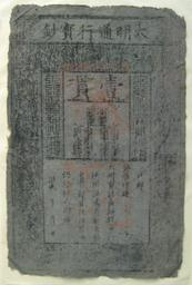 | Keywords: British Museum Ming banknote.jpg en Chinese Ming banknote for 1 guan 1 string of 1000 cash China AD 1375 Seal script inscription two vertical lines reading right-to-left on either side of 1 Guan 大明寶鈔 / å¤©ä¸‹é šè¡Œ Great Ming precious money for circulation throughout the empire zh å¤§æ˜Žå® é’ž BabelStone own Museum British Museum credit line 2010-08-21 Details Chinese Ming banknote for 1 guan 1 string of 1000 cash China AD 1375 Height 341 mm<br/>Width 222 mm Room 68 cc-zero Banknotes of the Ming Empire A History of The World in 100 Objects 72 Room 68 British Museum |