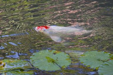 Keywords: brocade carp koi carp fish swim pond water white red cultivar japan japanese china wealth luck lily pad impressionist style impressionism mirroring water surface appear