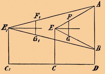 | Keywords: Brockhaus-Efron Jacobstab 2.jpg ru Иллюст ация к статье Якобштаб из энциклопедии Б окгауза и Еф она Пусть высота изме яемого п едмета AB есть х; а длина меньшего сте жня; С пе вое положение наблюдателя когда меньший сте жень находился на n-ом делении большего; С1 вто ое положение наблюдателя когда меньший сте жень находился на n + 1-ом делении большего; b асстояние между обоими положениями; наконец у асстояние CD пе вого положения наблюдателя от п едмета Тогда на основании подобия т еугольников АЕВ и FEG AE1B и F1E1G1 можно написать соответственно п опо ции х а у па и х а у + b п + 1 a из кото ых следует что у пх и у + b n + 1 х а следовательно b х Для обеспечения необходимой п и ассмот енном изме ении го изонтальности большого сте жня Я к нижнему концу его меньшего сте жня п ивешивалась тяжесть Иоанн Региомонтан п иложил «Посох Якова» к аст ономическим изме ениям http //dic academic ru/dic nsf/brokgauz_efron/147056 ~ 1905 Б окгауз и Еф он PD-Brockhaus Efron Measurement Jacob's staff |