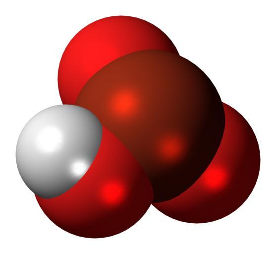 | Keywords: Bromic acid molecule spacefill.png Space-filling model of the bromic acid molecule an oxoacid of bromine in an oxidation state of +5 Color code F0F0F0 Hydrogen H white<br> F51E1E Oxygen O red<br> B42814 Bromine Br red-brown<br> 2011-11-21 own DS Visualizer Jynto talk Ball-and-stick version cc-zero Images by Jynto Bromic acid |