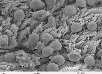 Keywords: Bronchiolar epithelium 2 - SEM.jpg Scanning electron microscope image of lung epithelium which consists of ciliated and non-ciliated bronchiolar cells There are red blood cells on the surface of the epithelium Zeiss DSM 962 SEM http //remf dartmouth edu/imagesindex html http //remf dartmouth edu/images/mammalianLungSEM/source/1 html Louisa Howard Charles Daghlian PD Louisa Howard and Charles Daghlian Cell biology Epithelium Scanning electron microscopic images |