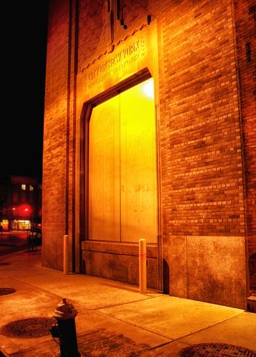 Keywords: brooklyn new york city urban power substation building night evening brick light lighting reflections sidewalk hdr