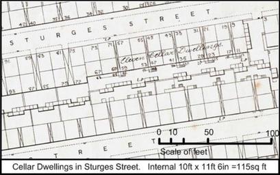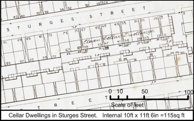 Keywords: Broomfields cellar dwellings.jpg Extract from 1891 1 500 map showing cellar dwellings in Sturges Street Handwritten comment from a surveyor 33 dwellings share 12 privies Original publication UK 1891<br/> Immediate source Second hand book shop 1891 UK Ordance Survey<br/> Life time Not applicable - UK OS a government department Ordnance survey retain copyright for 50 years Copyright expired 1941 PD-old-100 Original upload log en wikipedia Broomfields+cellar+dwellings jpg wikitable - 2014-08-22 10 05 530×332× 45206 bytes PeterEltham Uploading an old public-domain work using File Upload Wizard Broomfields |