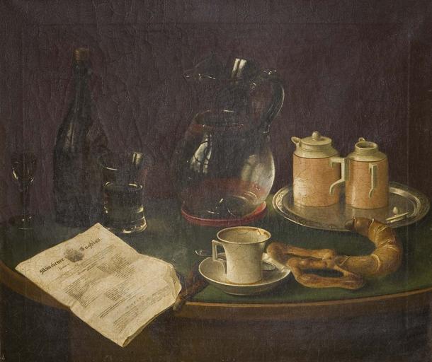 | Keywords: Brotzeit-Stilleben München 19Jh.jpg Brotzeit-Stilleben mit Gefäßen für Café Wasser und Likör sowie einer Brezel und dem Münchener Tagblatt Öl auf Leinwand unsigniert 56 x 66 cm http //www auktion-bergmann de/ Auktionshaus Bergmann century 19 Creator Unknown PD-old-100 Images from Auktionshaus Bergmann Still life paintings of tableware Still life paintings of bread Newspapers in art | ||||