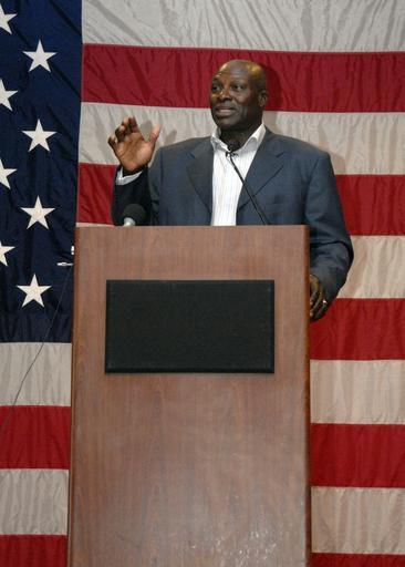 Keywords: Bruce Smith at Naval Station Norfolk 2009-10-13 2.JPG Former National Football League player Bruce Smith speaks U S Sailors Oct 13 2009 during his visit to the Vista Point Club at Naval Station Norfolk Va Smith who was recently inducted into the NFL hall of fame is meeting with the Sailors to thank them for their service to America http //www defenseimagery mil/imagery html guid 7de7b69a7be6d0fba0606b1c8d5cac464152f82d 2009-10-13 MC3 John Suits USN PD-USGov-Military-Navy Personality rights Files by User BrokenSphere Bruce Smith Naval Station Norfolk