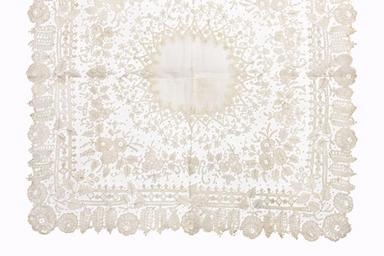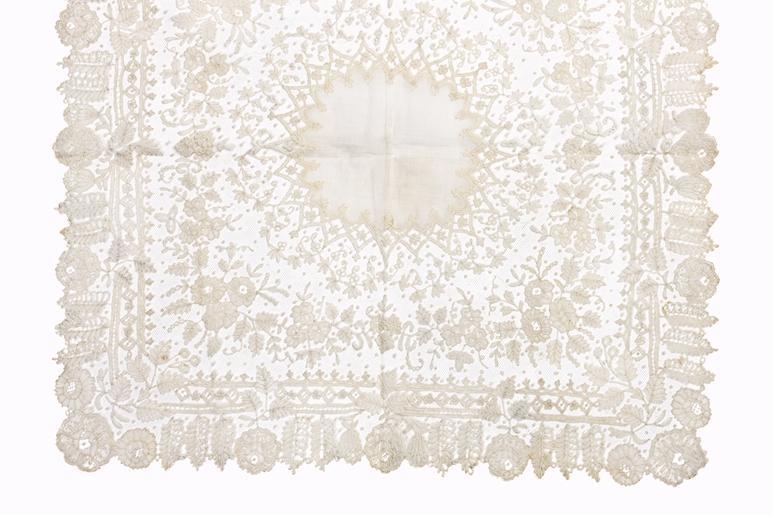 | Keywords: Brudnäsduk - Hallwylska museet - 85924.tif BRUDDRÄKT jämte sexton lösa föremål Bestående av klänning slöja krona krans och bukett näsduk strumpor strumpeband skor linne snörliv kalsonger nattröja nattmössa morgonmössa och tofflor Klänning Liv och kjol samt fyra lösa bandlängder till rosett Av vit sidenmoiré moiré antique med handknuten garnering av gulvitt silke Hand- och maskinsydd Liv Högt bestående av två framstycken två sidostycken och ett ryggstycke alla sneddade Knäppning framtill med kulformiga vita snörmakeriknappar samt knapphål nedanför dessa hakar och hyskor av vit metall isydda med kaststygn under en kantslå av vitt siden Ärmar halvlånga nedre kanten rak Liv och ärmar fodrade med vitt glansigt bomullstyg s k kambrik I sömmarna stöd av valfiskben Kjol Bestående av åtta raka våder baktill ett fållat sprund samt i högra framsömmen en avlång ficka av tyg som livfodret sömmarna maskinsydda Mått Liv längd omkring 41 cm ; bröstvidd omkring 50 cm ; halsvidd omkring 37 cm ; midjevidd omkring 54 cm Ärmar längd omkring 54 cm ; vidd omkring 32 cm Holkar längd omkring 18 cm ; vidd omkring 26 cm Bårder bredd omkring 4 6 5 och 7 cm Tofs längd omkring 5 5 cm Frans längd omkring 3 5 och 8 cm Kjol längd fram omkring 1 16 m ; bak omkring 1 77 m ; vidd omkring 5 48 m Linning längd omkring 64 cm ; bredd omkring 3 cm <br/><br/>Bandlängder <br/>Av vit sidenrips med satinkanter de två korta till öglor de två långa till ändar de senare på vardera ytterändan med garnering som på livet <br/><br/>Mått <br/>Längd 0 41 och 1 36 m ; bredd 18 cm<br/><br/>Anm <br/>Rosetten troligen från en senare modellförändring <br/><br/>Slöja <br/>Av vit silkestyll Rektangulär i två olika stora stycken <br/><br/>Mått <br/>Stora stycket längd omkring 2 32 m ; bredd omkring 1 65 m <br/>Lilla stycket längd omkring 1 68 m ; bredd omkring 1 56 m<br/><br/>Krona <br/>Rund Stommen bestående av åtta radiella byglar av mörk karkas nedtill fästa vid en horisontell liggande ring byglarnas övre ändar sammanlöpande upptill i mitten till en nedåtvänd kort spets samt virade med tätt sittande myrtenkvistar <br/><br/>Krans <br/>Med stomme som kronan samt omvirad med myrtenkvistar <br/><br/>Bukett <br/>Av myrten med rester av vita liljor <br/>Dessutom fragment av en liten bukett bestående av en ros samt gullborste Linosyris vulgaris eller Aster linosyris; användes på 1800-talet och ännu i början av 1900- talet som grönt i buketter o d <br/><br/>Näsduk <br/>Av vit linnebatist med bred vit spets application de Bruxelles <br/>Kvadratisk handsydd <br/>Spetsen knypplad samt sydd på maskinvävd tyll <br/>Spetsen fastsydd med efterstygn av vit tvåtrådig linnetråd vid ett mittstycke av vit linnebatist <br/><br/>Mått <br/>Sidlängd omkring 43 cm <br/><br/>Strumpor ett par <br/>Av vitt silke vävda <br/>På vardera smalbenets utsida en tät rand upptill med axliknande avslutning samt nedtill tvådelad med en lång rand på foten och en kortare på hälen <br/>Upptill en bred fåll på utsidan med två par parallella smala ljusröda ränder <br/><br/>Mått <br/>Längd omkring 79 cm ; vidd omkring 22 5 cm <br/><br/>Strumpeband ett par <br/>Handsydda Av ljust rödgredelint sidentaftband varpå pålagt ett mittparti av vitt sidentaftband med stadkanterna omvikta och fastsydda med fållstygn av ljust rödgredelint silke <br/>Bandens ändar trubbvinkligt urklippta <br/><br/>Mått <br/>Längd omkring 1 m ; mittparti längd 25 cm <br/>Band bredd omkring 2 5 cm <br/><br/>Skor sedermera s k pumps ett par <br/>Av vit sidenatlas <br/>Hand- och vändsydda <br/>På vardera sidan på mitten två snett tvärgående efterstygnssömmar s k sidosömmar av vitt silke <br/>Knytband av vita smala tvåskaftade sidentaftband <br/>Bakstycket fodrat med vitt getskinn framstycket med vitt tvåskaftat linnetyg <br/>Sula av tunt ljusbrunt läder med tvärskuren tå Fodersula av vitt getskinn <br/>Klack av trä halvhög svagt insvängd klädd med vit sidenatlas samt med ytterlapp av ljusbrunt läder fäst med sex stift av mässing <br/><br/>Mått <br/>Längd omkring 24 cm ; bredd omkring 6 2 cm<br/>Klack höjd omkring 3 cm <br/>Knytband längd omkring 52 cm ; bredd 0 8 cm <br/><br/>Linne <br/>Av vitt tvåskaftat linnetyg samt med broderier <br/>Hand- och maskinsytt <br/>Fram- och bakstycke sneddade samt hopsydda med fällsömmar <br/>Ärmhålen starkt sneddade uppåt ärmarna korta med kilar <br/>Halsurringningen svagt rundad samt tätt rynkad <br/>Alla sömmar sydda med fin vit bomullstråd <br/><br/>Mått <br/>Längd omkring 1 07 m ; vidd nedtill 1 8 m <br/>Ärmar längd omkring 7 8 cm ; vidd omkring 36 cm <br/>Halslinning längd omkring 93 cm ; bredd omkring 0 8 cm <br/><br/>Snörliv <br/>Av vitt fyrskaftat bomullstyg och vitt tvåskaftat linnetyg <br/>Handsytt <br/>Två symmetriska sneddade stycken hopsydda framtill i mitten och bildande en lång spets Nedtill på vardera sidan om denna fyra kilar en tresidig och tre fyrsidiga upptill två starkt sneddade tresidiga kilar Mellan kilarna ett stöd av valfiskben utanför bortre kilen sex dylika stöd <br/>Sömmarna sydda dels med vitt silke dels med vit bomullstråd <br/><br/>Mått <br/>Höjd fram omkring 35 5 cm ; bak omkring 35 cm <br/>Midjevidd omkring 46 cm <br/><br/>Kalsonger s k öppna ett par <br/>Av vitt smalrandigt fyrskaftat bomullstyg samt med broderi <br/>Handsydda och handbroderade <br/>Bestående av två fram- och baktill sneddade stycken på framsidan hopsydda ett stycke upptill med fällsöm <br/>Alla sömmar sydda med vit fin bomullstråd <br/>Mått <br/>Längd omkring 84 cm ; linning längd omkring 94 cm <br/>Ben vidd nedtill omkring 56 cm ; band längd omkring 83 cm <br/><br/>Underkjol <br/>Av vitt tvåskaftat bomullstyg samt med broderi <br/>Hand- och maskinsydd <br/>Bestående av fem raka våder upptill tätt rynkad runtomkring samt fastsydd med fållstygn vid en sneddad linning med dragsko <br/>Alla sö