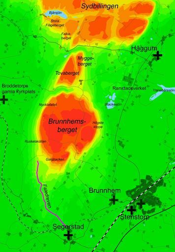 | Keywords: Brunnhemsberget på Falbygden karta.jpg en Map over Brunnhemsberget a table-mountain in Falköpings municipality in the Falbygden area former Skaraborg county Västergötland Västra Götaland county Sweden Brunnhemsberget is situated in the parishes Brunnhem Segerstad and Broddetorp in Gudhem hundred and Häggum parish in Valle hundred Scale 1 20 000 Topography Altitude is shown with different colours from green over yellow to red Water Lakes are blue Churches The churches of Häggum Segerstad and Stenstorp parishes are marked with black crosses The church-ruins of Broddetorp Brunnhem and Stenstorp are marked with grey crosses Roads populated areas villages farms and larger buildings are different shades of grey Railways are black-and-white Faledreven a old 2 9 km long road for cattle driving is shown in magenta Other table-mountains shown on the map are Tovaberget Myggeberget and the most southern part of Billingen Northeast of Brunnhemsberget is the abandoned uranium mine Ranstad or Ranstadsverket The lakes Blackesjön and Tranebärssjön belongs to the mining area sv Karta över Brunnhemsberget ett platåberg i Falköpings kommun på Falbygden i f d Skaraborgs län i Västergötland i Västra Götalands län i Sverige Brunnhemsberget ligger i socknarna Brunnhem Segerstad och Broddetorp i Gudhems härad samt Häggums socken i Valle härad Skala 1 20 000 Topografi Höjden över havet visas med olika färger från grönt över gult till rött Ekvidistans 10 m Vatten Bjärsjön Blackesjön Tranebeärssjön och dammar är blå Kyrkor Kyrkorna i Häggum Segerstad och Stenstorp är markerade med svarta kors Kyrkoruinerna Broddetorps gamla Brunnhem och Stenstorps gamla är markerade med grå kors Vägar tätbebyggelse byar gårdar och större byggnader är markerade i gråtoner Järnvägen Västra stambanan är svartvit medan den nedlagda banan mellan Stenstorp och Varnhem är mer gråtonad Faledreven en gammal 2 9 km lång fägata från Segerstads by upp mot bergskanten är markerad med magenta De platåberg som visas på kartan är förutom Brunnhemsberget Tovaberget Myggeberget och de sydligaste delarna av Sydbillingen Nordöst om Brunnhemsberget ligger den nu nedlagda urangruvan Ranstadsverket ofta kallad bara Ranstad Blackesjön och Tranebärssjön hör till Ranstadsverket own Gunnar Creutz 2011-01-03 Cc-zero Maps of Falköping Municipality Gudhems härad Häggums socken Table mountains of Västergötland Maps by User Achird CC0 1 0 Files by Gunnar Creutz |
