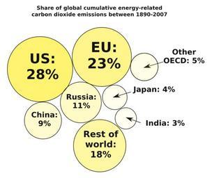 | Keywords: Bubble diagram showing the share of global cumulative energy-related carbon dioxide emissions for major emitters between 1890-2007.svg carbon dioxide emissions between 1890-2007 Major emitters are shown percentage share in brackets the United States 28 the European Union 23 Russia 11 China 9 other OECD countries 5 Japan 4 India 3 and the rest of the world 18 Data are from IEA 2009 For more information see greenhouse gas The area and colouring of the circles is proportional to the share of emissions The radius of the circles equals the square root of area / References IEA 2009 http //www worldenergyoutlook org/media/weowebsite/2009/WEO2009 pdf World Energy Outlook 2009 p 180 p 182 of PDF http //www iea org/ International Energy Agency IEA Paris France ISBN 978-92-64-06130-9 own Enescot 2012-11-13 Data Data from the IEA 2009 are given below as comma-separated values CSV The data were exported from OpenOffice 3 4 1 Calc using the following options enclosed in braces Character set Western Europe Windows-1252/WinLatin ; Field delimiter ; text delimiter <pre> Region/country a area r radius d diameter Rest of world 18 2 3936536824 4 7873073648 India 3 0 9772050238 1 9544100476 Japan 4 1 1283791671 2 2567583342 Other OECD 5 1 261566261 2 523132522 China 9 1 6925687506 3 3851375013 Russia 11 1 8712051593 3 7424103185 European Union 23 2 7057581899 5 4115163798 United States 28 2 9854106607 5 9708213214 </pre> Global warming graphs Atmospheric carbon dioxide Cc-zero |