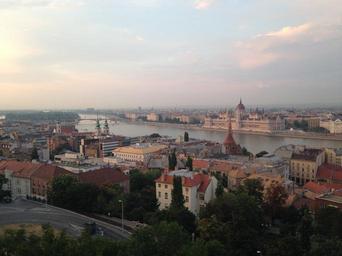 Keywords: budapest parliament building view evening cityscape danube river hungary colorful sunset air