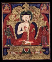 Keywords: Buddha Vairocana - Google Art Project.jpg This representation of Buddha Vairocana the Resplendent One features several of his defining characteristics including his white color performing the teaching gesture dharmacakramudra and sitting on an elaborate lion throne The two bodhisattvas flanking him ”one green and carrying a sword the other red and holding a lotus ”and the teachers in the upper corners cannot be identified with certainty This painting was likely part of a set and only the knowledge of the whole set enables the identification of the secondary figures 464096 Unknown /collection/rubin-museum-of-art/artwork/buddha-vairocana-unknown/480004/ author /collection/rubin-museum-of-art/ Rubin Museum of Art 342005 http //www rmanyc org/ 12/8/2011 6 41 54 PM /collection/rubin-museum-of-art/artwork/buddha-vairocana-unknown/480004/ 1301 1 14th century 1 Pigments on cloth 480004 False 1400 31 14th century 12 Complete 3/24/2012 2 50 26 AM F1998 3 6 Rubin Museum of Art F1998 3 6 Painting 1300 1410 Tibet 14th century False 0 83203125 Object buddha-vairocana-unknown Buddha Vairocana b - RMA Masterworks Jewels of the Collection 03/11/11 - 1/9/12 Rotation 1 - RMA March 24th Asia Week Reception 2004 Pigments on cloth special url_id wwE_J7zFIMK4zA PD-old-100 Google Art Project works by unknown artist Paintings of the Buddha Tibetan art in the Rubin Museum of Art Vairocana |