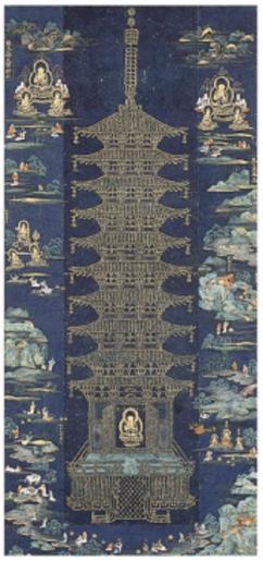 Keywords: Buddhist Paradise with Golden Pagoda.gif A picture of Buddhist Paradise with Golden Pagoda 紺紙著色金光明 王経金字 塔曼荼羅図 konshichakushoku konkōmyō saishō ōkyō kinji hōtō mandarazu one of ten hanging hanging scrolls mandalas 139 7 cm x 54 8 cm Gold paint on indigo blue paper Located at Chūson-ji Hiraizumi Iwate Japan http //www mext go jp/b_menu/hakusho/image/hpab200101/xb2090401 gif Ministry of Education Culture Sports Science and Technology author Heian period before 1185 PD-old-100 Chusonji Mandalas of Japan Paintings of the Heian period National Treasures of Japan paintings Konkōmyō Saishōō-kyō |