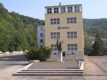 Keywords: Budova ředitelství Adamovských strojíren.JPG Budova ředitelství Adamovských strojíren lidově Bílý dům s památníkem československo-sovětského přátelství socha zvaná Mařena own 2007-08-08 Lukáš Malý uvolňuji dílo Adamov Adamov Machine Works