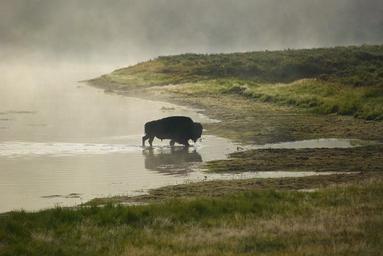 Keywords: buffalo bison fog walking yellowstone animal wild west park