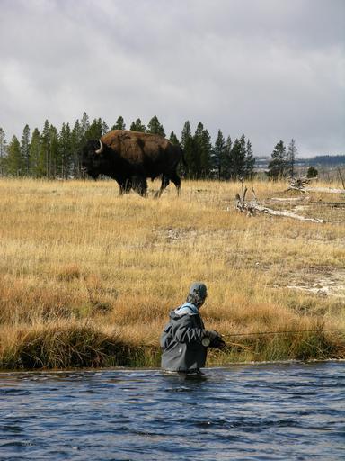 Keywords: BuffaloAndAnglerFireholeRiverYNP.jpg Angler and Bison on Firehole River Yellowstone National Park 2009 own 2009-10-16 Mike Cline Bison bison in Yellowstone National Park Firehole River Fly fishing