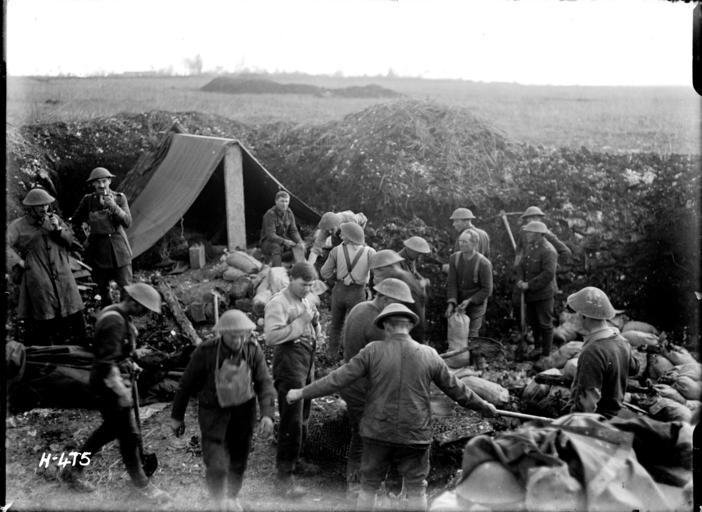 Keywords: blackandwhite monochrome outdoor people black and white New Zealand soldiers working to set up a battalion headquarters near the front line. Shows sand bags being filled as the troops dig in and fortify their position. Photograph taken Courcelles 6 April 1918 by Henry Armytage Sanders. Inscriptions: Inscribed - Photographer's title on negative -bottom left: H475. Quantity: 1 b&w original negative(s). Physical Description: Dry plate glass negative 4.75 x 6.5 inches Building a battalion headquarters during World War I, Courcelles. Royal New Zealand Returned and Services' Association :New Zealand official negatives, World War 1914-1918. Ref: 1/2-013093-G. Alexander Turnbull Library, Wellington, New Zealand. natlib.govt.nz/records/22727467 New Zealand soldiers working to set up a battalion headquarters near the front line. Shows sand bags being filled as the troops dig in and fortify their position. Photograph taken Courcelles 6 April 1918 by Henry Armytage Sanders. Inscriptions: Inscribed - Photographer's title on negative -bottom left: H475. Quantity: 1 b&w original negative(s). Physical Description: Dry plate glass negative 4.75 x 6.5 inches Building a battalion headquarters during World War I, Courcelles. Royal New Zealand Returned and Services' Association :New Zealand official negatives, World War 1914-1918. Ref: 1/2-013093-G. Alexander Turnbull Library, Wellington, New Zealand. natlib.govt.nz/records/22727467 |