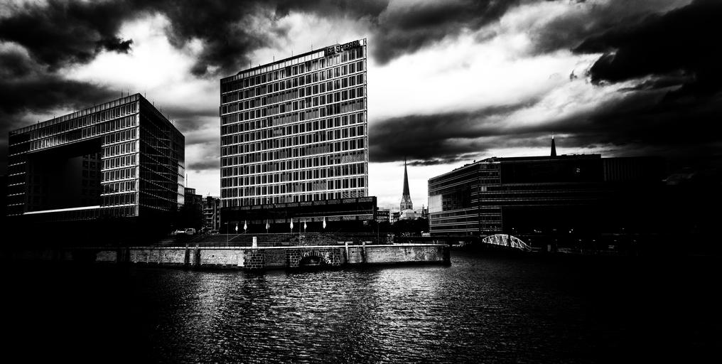 Keywords: building hamburg facade window glass architecture mirroring water lake city modern atmosphere mirror glass black and white light contrast