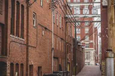 Keywords: buildings apartments bricks alley trash cans garbage cans dumpsters city urban