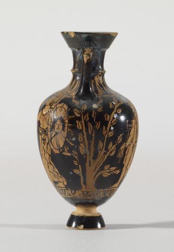 | Keywords: Bulas Group - Miniature Panathenaic Amphora - Walters 4859 - Left.jpg This amphora with a flaring offset mouth depicts Poseidon and Athena on one side and Hermes on the other Poseidon stands in profile to the right with his left foot propped up on a rock and his left arm bent and resting on his left knee In his right hand he holds a trident upright which extends into the ornament above A mantle is draped around his back right thigh and over his left leg Athena stands to the left holding a spear upright in her right hand and she has a shield with a Gorgoneion and a star device on her left arm She wears a peplos girded at the waist necklace bracelet and Attic helmet Hermes is depicted standing to the left He holds a kerykeion in his right hand at waist level and wears a pestasos chlamys and mask Behind him is a stele on which his left arm rests while to the left and right are olive trees which fill the areas underneath the handles The subject matter is not the usual for Panathenaic amphorae which normally have Athena on one side and athletes on the other Poseidon and Athena are here depicted calmly standing and facing one another on the front a juxtaposition which brings to mind their contest for the city of Athens This story is first known to have been depicted in the west pediment of the Parthenon but there is no sign of strife in our scene If Hermes wears a mask as the black line running from his chin up suggests the scene may in some way have been influenced by a dramatic performance The generally poor quality of drawing however makes it impossible to determine if the painter meant to indicate a mask or not The olive trees beneath the handles are approporiate fillers because of the tree's association with Athena the story of the contest Panathenaic ampohorae and the Panathenaia early 4th century BC Classical terracotta cm 8 8 4 6 h x max diam ; at rim cm 2 55 diam ; at foot cm 1 8 diam accession number 48 59 13939 Don Marcello Massarenti Collection Rome 1897 cat no 153 Henry Walters city Baltimore Walters Art Museum Henry Walters Acquired by Henry Walters with the Massarenti Collection 1902 Goddess and Polis The Panathenaic Festival in Ancient Athens Hood Museum of Art Hanover; Tampa Museum of Art Tampa; Virginia Museum of Fine Arts Richmond; Princeton University Art Museum Princeton 1992-1993 place of origin Greece Walters Art Museum license Ancient Greek red-figure pottery in the Walters Art Museum Miniature Panathenaic amphoras Media contributed by the Walters Art Museum needs category review Bulas Group |