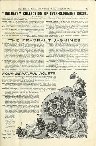 | Keywords: Bulbs roses plants of all kinds for winter blooming (15773385774).jpg Miss Ella V Baines The Woman Florist Springfield Ohio <br> 25 <br> HOLIDAY COLLECTION OF EVER-BLOOMING ROSES <br> I have made a selection of the verv best Roses for Winter blooming embracing 1 a wide range of color I commend this col- <br> lection to all who desire to grow Roses in the house during Winter I have seen all these Roses in bloom during the Holidays and <br> continuing right through to Easter time <br> General Robert E Lee This Rose will produce more beautiful <br> Roses in the Winter than any Rose I grow A small bush <br> will produce hundreds of blooms Color orange-yellow <br> Very rich and beautiful Extra fine <br> Bridesmaid The most elegant pink Rose Very large Buds <br> extra fine <br> Champion of the World It is the Champion bloomer It com- <br> mences to bloom as soon as started to grow and continues to <br> bloom in the greatest profusion both Winter and Summer <br> A rich deep rosy-pink or flesh color <br> Price for the collection of six choice Holiday blooming Roses only 50 cents; three collections for 1 25 <br> year-old plants 35 cents each ; or the six for 1 50 <br> Kaieerin Augusta Victoria A new pure white Rose Very- <br> large and double A royal Rose in every respect A Rose <br> I can recommend <br> Christine do Nouc New This is a great Winter-blooming <br> Rose with buds and flowers of the largest size Color richest <br> crimson The best Rose of its color <br> Star of Gold This is the best all round deep golden-yellow <br> Tea Rose that is grown The buds are very large and <br> shapely while the flower is double to the center and it is a <br> deeper golden-yellow than Marechal Neil Don't fail to try <br> this variety <br> Large two- <br> the fragrant jasmines <br> Grand Duke of Tuscany Easily grown even small plants bear- <br> ing a profusion of double creamy-white flowers having a <br> delicious perfume A plant of this lovely variety will when <br> in bloom scent up a whole yard or house It is by far the <br> most delicious in bloom and fragrance of all Jasmines or <br> indeed for that matter I know of no flower that emits such <br> a delightful fragrance It is sweeter than a Tuberose and <br> that is saying a good deal for it Will thrive out of doors <br> and bloom through the season A magnificent plant and <br> will become one of the most valuable and popular pot plants <br> when it becomes better known It can be stored in a dry <br> cellar in Winter It will please you Try it Price fine <br> plants 25 cents each; large plants 75 cents each <br> ’ rand i Morn in This is a beautiful plant with small glossy <br> evergreen foliage handsomely arranged on long graceful <br> branches which are inclined to vine It blooms in the Fall <br> and Winter bearing in the greatest profusion small pure <br> white flowers of a spicy fragrance which is fully delicious <br> A splendid house plant Price 10 cents each; large plants <br> 25 cents each <br> Malayan or Confederate Jasmine Now that climbers are so in <br> vogue I am pleased to be able to offer this very rare sort <br> knowing tbat it will delight every purchaser To be able to <br> have the most delicate sweet-scented and pure yellow <br> waxy-like flowers in profusion almost the whole year round <br> and dark evergreen foliage to set them off to advantage is <br> something that cannot be had from other plants For florists <br> nothing could be more useful as it blooms more profusely in <br> Winter than at any other time making it a most desirable <br> house plant The vine will live a life time Price 10 cents <br> each; large plants 40 cents each <br> New Jasmine Maid of Orleans This makes handsome specimens <br> in the South where it is hardy It will produce more flow- <br> ers twice over than any of tne Jasmines Price 15 cents each; <br> large plants 50 cents each <br> Cape Jasmine This well-known variety grows into a fine large <br> bush fine rich glossy fnliage and large double flowers of <br> delicious fragrance Price 10 cents each; large plants 25 <br> cents each <br> Revolutum A yellow-flowered Jasmine hardy and exquisitely- <br> fragrant Price 10 cents each <br> Special Offer The six distinct kinds of Jasmines costing 80 cents for only 65 cents A great bargain <br> FOUR BEAUTIFUL VIOLETS <br> Of all delightful perfumes that of Violets is the most delicate and pleasant and <br> places the modest little blue flowers among our greatest favorites Violets grow <br> and bloom during the dead of Winter with no trouble whatever if given a cool <br> situation but will not succeed in a warm place The following four sorts are the <br> best of all the Violets ard are all distinct in color <br> tady Hume Campbell This is the finest of ail double blue Violets It is simply <br> wonderful the number of beautiful flowers it produces In color a lovely shade <br> of the richest intense blue A charming contrast with the white variety Price <br> 15 cents each <br> New Violet California This beautiful single flowered Violet has created a deci- <br> ded sensation It was raised in California where it is cultivated by the hun- <br> dreds of acres for cut flowers Buyers prefer it to all others It is entirely hardv <br> and of the richest dark blue and very fragrant Price <br> 15 cents each <br> New Double White Perpetual Flowering Violet Swanley <br> White or Queen of Fragrance Of all the White Vio- <br> lets this is the best either for pot culture in the house <br> or bedded out In pots it grows luxuriantly and is <br> loaded with flowers It is not an uncommon sight to <br> see as many as fifty large flowers open at once pre- <br> senting a beautiful sight their delicious perfume fill- <br> ing a whole room Price 10 cents each <br> Hardy Double English Violet This Violet is entirely <br> hardy perfectly double a deep violet purple color <br> and most deliciously fragrant It surpasses the well <br> known hi Marie Louise Violet in richness of color <br>