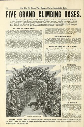 MAKE A MEME View Large Image Bulbs roses plants of all kinds for winter blooming (16394920852).jpg 24 <br> Miss Ella V Baines The Woman Florist Springfield Ohio <br> FIVE GRAND CLIMBING ROSES <br> I here offer five of the grandest of all Climbing Roses each one being ...