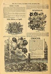 | Keywords: Bulbs, roses, plants of all kinds for winter blooming (15963066093).jpg 10 <br> Miss Ella V Baines The Woman Florist Springfield Ohio <br> MIXED TULIPS <br> I have a large stock of unnamed Tulips for bedding which <br> I price so low as to make a large mass ol these showy flowers <br> a matter of trifling expense They are excellent bulbs and <br> will bear handsome blooms Double and single colled ions are <br> keptseparate Several hundred bulbsat the quotations below <br> involve less expense than is required to secure a few Summer <br> bedding plants and in the matter of display they are fully a3 <br> valuable during their season as an equal number of ordinary <br> blooming plants <br> Superfine Mixture Single Tulips In fifty choicest <br> kinds splendid flowers 25 cents per dozen; 1 75 per <br> hundred <br> Superfine Mixture Double Tnllps In fifty choicest <br> kinds splendid llowers 23 cents per dozen; 1 75 <br> per bnndred <br> Superfine Mixture of Parrot Tulips 35 cents per <br> dozen; 2 00 per hundred <br> Scilla Sibirica or Squill <br> Scilla Sibirica <br> STAR HYACINTH Scilla Sibirica is one of the loveliest <br> Spring flowers It has a color almost as deep as the sky itself <br> Quite hardy and flowers out of doors at the same time as the <br> Snowdrop in front of which it has a charming effect Planted <br> in pots and kept indoors it may be had in bloom as early as <br> Christmas Its magnificent bright blue color makes it suitable <br> for any decorations whatever Two for 5 cents; 25 cents <br> per dozen <br> SPARAXIS <br> Sparaxis <br> From the Cape of Good Hope producing flowers about Itae <br> size and shape of those of the Crocus The colors are of an IB- <br> finite variety Pure white yellow orange red purple and Yie- <br> let are to be found either separate or blended in pleasing va - <br> riegation Three or four bulbs may be put in a four-inch pot <br> with good effect They are charming Try them 3 cento <br> each; 25 cents per dozen <br> CROCUS <br> The Crocus is one of the first flowers of <br> Spring and oneof the best for blooming <br> in the house aHug Winter Haifa doz- <br> en bulbs may be planted in a pot and will <br> make a very pretty show For garden <br> culture plant bulbs two inches deep and <br> two or three inches apart They are so <br> cheap and pretty they ought to be found <br> in every garden in abundance They <br> bloom splendidly when planted on the <br> lawn among the grass They lift their <br> bright heads up through the sod very <br> early and give the lawn a charming as- <br> pect The sorts I offer are especially <br> strong and fine 8c per doz ; 40c per <br> hundred by express If by mail <br> 50c per hundred <br> Sir Walter Scott Striped white and <br> purple <br> Cloth of Gold -Brightest golden <br> yellow <br> Cloth of Silver Beautiful silver <br> Dandy -Light blue bordered white <br> Prince Albert -Richest dark pur- <br> ple <br> Mont Blanc Purest white <br> Giant Yellow Fine yellow <br> Extra Fine Mixed All colors <br> Bed and Cluster of Croctis 41846873 130959 64576 Page 10 Text http //www biodiversitylibrary org/page/41846873 1901 10 5962/bhl title 64576 Ella V Baines Firm ; Henry G Gilbert Nursery and Seed Trade Catalog Collection NameFound Scilla NameConfirmed Scilla L EOLID 33607 NameFound Sibirica NameConfirmed Sibirica NameBankID 5108068 NameFound Sparaxis NameConfirmed Sparaxis Ker-Gawl EOLID 38091 Biodiversity Heritage Library Bulbs roses plants of all kinds for winter blooming 1901 Garden Stories Bulbs Plants Catalogs Flowers Plants Ornamental Seed industry and trade Seeds Trade catalogs U S Department of Agriculture National Agricultural Library bhl page 41846873 dc identifier http //biodiversitylibrary org/page/41846873 bhlGardenStories Miss Ella V Baines Crocus BHLinbloom bulbs plants plants ornamental u s department of agriculture national agricultural library bhlgardenstories miss ella v baines bhlinbloom Information field Flickr posted date ISOdate 2015-02-19 CC-BY-2 0 BioDivLibrary https //flickr com/photos/61021753 N02/15963066093 2015-08-24 02 52 13 cc-by-2 0 PD-old-70-1923 Bulbs roses plants of all kinds for winter blooming Photos uploaded from Flickr by FĂŚ using a script |