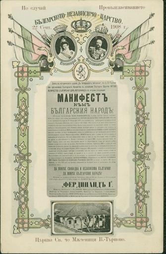 | Keywords: Bulgarian Indipendence Manifesto 1908 Postcard.jpg Пощенска ка тичка издадена по повод на п овъзгласяването на Бълга ската независимост Bulgarian Declaration of Independence 1908 author ЦДА 3K она хически институт 15 478 124 credit line exhibition history Bulgarian Archives State Agency unknown other versions Anonymous-EU Declaration of Independence of Bulgaria Ferdinand I of Bulgaria Documents in Bulgarian | ||||