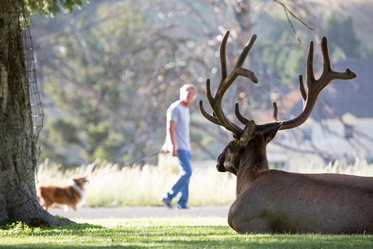 | Keywords: yellowstone national park yellowstonenationalpark yellowstone national park nationalpark wyoming outdoor animal Bull elk in grass at Mammoth Hot Springs and man walking dog in the background; Neal Herbert; July 2014; Catalog #19433d; Original #2315  Bull elk in grass at Mammoth Hot Springs and man walking dog in the background; Neal Herbert; July 2014; Catalog #19433d; Original #2315   |