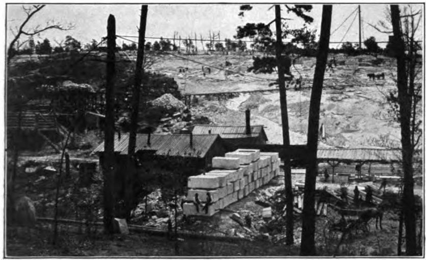 | Keywords: Bulletin 426 Plate XIX A Mount Airy Granite Corporation Quarry.jpg Surry County NC <br>Text from the volume describing this figure <br>The North Carolina Granite Corporation's Mount Airy quarries located less than 1 mile northeast of Mount Airy were opened in 1889 and the first shipment of stone from them was made in July 1890 The total shipment of granite from these quarries from 1800 when 135 carloads were shipped to 1904 when 1 282 carloads were shipped was 13 232 carloads See Pl XIX A B Quarrying is confined to a 40-acre tract of continuously exposed granite over the slope and top of a long hill which rises about 125 feet above the valley bottom The company holds more than 200 acres additional of ground over which granite is exposed Quarrying has extended over practically the entire 40-acre tract the greatest depth of working being about 30 feet The rock is a biotite granite of very light gray nearly white color and medium grain The biotite is not except in one opening equally distributed through the granite but is entirely absent from some parts of it is uniformly distributed through others and shows a marked tendency to segregation in still other parts Quartz-feldspar areas of extreme whiteness ranging from several inches to as many feet in diameter in which biotite is entirely lacking or represented by only a few shreds are common through the granite This unequal distribution of the characterizing accessory biotite renders the granite in places less uniform in color than might be desirable for some purposes The granite that has a uniform color is most pleasing in appearance and forms excellent and desirable stone for all uses except for monumental stock for which the contrast of color between the cut and polished faces is not great enough Microscopically the principal minerals are potash feldspar orthoclase and microcline soda-lime feldspar oligoclase quartz and biotite with accessory apatite and zircon and secondary chlorite epidote light-colored mica and iron oxide Plagioclase feldsparexceeds the potash feldspars in amount Zonary structure and Carlsbad twinning are beautifully developed in some of the feldspars Intergrowths of the feldspars with one another and with quartz are abundant 1910 Granites of the Southeastern Atlantic States Bulletin 426 United States Geological Survey Government Printing Office Washington 1910 Watson Thomas Leonard other versions PD-USGov Geology Quarrying |