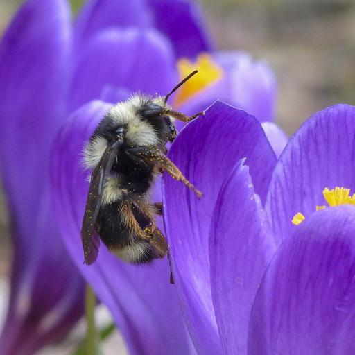 Keywords: bumble bee purple crocus plant flower spring season insect nature animal macro pollen nectar collecting garden