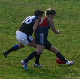 | Keywords: Bump womens football.jpg  Melbourne University player bumps Darebin Falcons player off the ball in contest for possession over a ball on the ground from the 2007 Victorian Women's Football League Grand Final Own Spewmaster Women's Australian rules football 2007 in Australian rules football |
