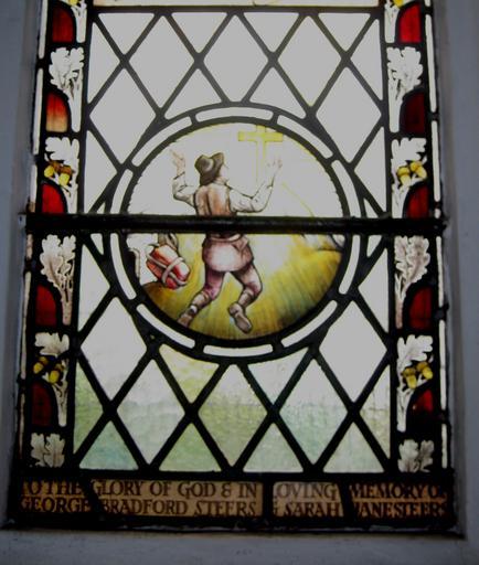 Keywords: Bunyan Roundel.JPG en Roundel from one of Arnold Robinson's windows in the Kingsdown area of Bristol Robinson designed and installed four three-light windows this a short while after the 1927 restoration and in the central light of these windows he depicts in turn John Bunyan William Tindale Archbishop Cranmer and Charles Wesley The right and left hand lights of the four windows are either plain or hold some coloured glass The window dedicated to Bunyan has John Bunyan in the centre light with a copy of Pilgrim ™s Progress tucked under his arm The window is inscribed To the Glory of God in loving memory of George Bradford Steers Sarah Jane Steers Below Bunyan Robinson painted a roundel with a scene from the Pilgrim ™s Progress The three-light window featuring William Tindale has Tindale carrying a copy of his famous Bible and in a roundel beneath he is depicted writing that Bible The window is inscribed In Loving Memory of Richard Dalton Another three-light window depicts Charles Wesley who had lived in nearby St James ™s which through growth and popularity led to the need for a new church in the adjacent new suburb of Kingsdown that new Church being St Matthews and in the roundel beneath he is shown writing at his desk The inscription reads In Loving Memory of Albert E Hill Another three-light window depicts Archbishop Cranmer and in a roundel below we see Cranmer about to be burnt at the stake The inscription reads In loving memory of Catharine Hill The Hills and Dalton were long-serving Churchwardens of St Matthew ™s 2012-05-08 own Weglinde cc-zero Uploaded with UploadWizard Stained glass windows in Bristol John Bunyan |