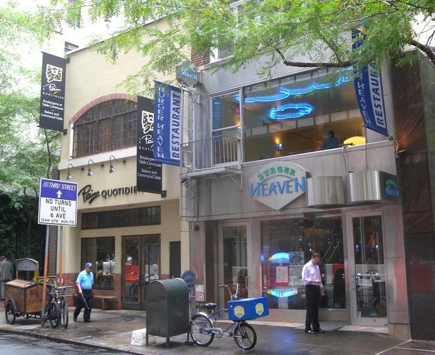 | Keywords: Burger Heaven 53 bike jeh.jpg en Looking north across 53d St at Burger Heaven and a bread store and their respective delivery bikes own Jim henderson 2010-08-18 Cc-zero 40 45 36 N 73 58 29 8 W heading NbW Fast food restaurants in New York City Manhattan between East 42nd and East 59th Streets 53rd Street Manhattan |