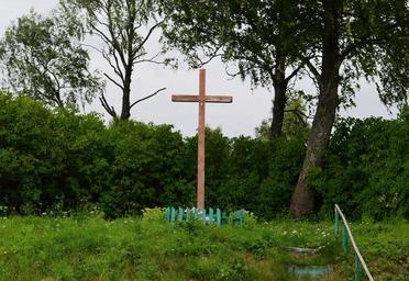 Keywords: Burkila, kryžius.JPG Kryžius kapinėse laidotų mirusiųjų atminimui Burkila Vilniaus r own 2015-07-26 Šarūnas Šimkus Villages in Vilnius District Municipality Wooden crosses in Lithuania