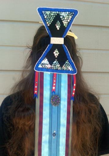 | Keywords: Burrows dooshtoh.jpg en Caddo girl modeling a dush-toh the traditional Caddo ornamental hairpiece for dancing made by Tracy Burrows Caddo-Delaware Oklahoma The headboard is wood covered with black cloth and held in place with a metal band The piece is decorated with seed beads sequins ribbons and an ornamental pin own Caddo 2011 Caddo Native American dance regalia Fashion Female headgear | ||||