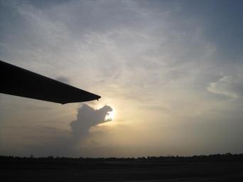 Keywords: burundi africa aircraft wing bright sky clouds sun beaking through blue sky late afternoon light