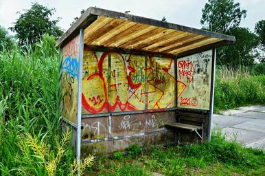 Keywords: bus stop bus shelter shelter public transport roadside waiting travel graffiti red green blue yellow