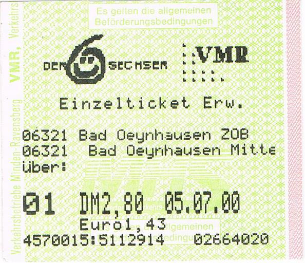 Keywords: Bus ticket Sechser Bad Oeynhausen 2000.jpg Bad Oeynhausen in July 2000 Bad Oeynhausen im Juli 2000 Bad Oeynhausen en Juillet 2000 Bad Oeynhausen nel luglio 2000 Бад-Эйнхаузен в июле 2000 года uk квиток на автобус з Бад-Эйнхаузен в липні 2000 оку lt Autobusų bilietų Bad Eynhauzenaje 2000 m liepos Bad Oeynhausen w lipcu 2000 r own Saviour1981 2000-07-05 manufacture 2010-11-05 upload Der Sechser Bus tickets of Germany Oeynhausen July 2000 in Germany Bad Oeynhausen |