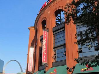 Keywords: busch stadium baseball gateway arch ball park brickwork bricks arches arch st louis cardinals saint louis missouri usa america sport stadium redbirds ballpark red architecture exterior banners