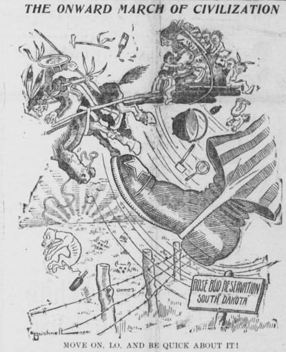 Keywords: Bushnell cartoon about evicting the Sioux from South Dakota.jpg Theodore Roosevelt President Roosevelt making the lands of the Rosebud Indian Reservation available for purchase by settlers for three dollars an acre E A Bushnell depicted a Sioux family being physically kicked into the air by the giant foot of Uncle Sam identifiable by the striped pant-leg and starred boot The title is THE ONWARD MARCH OF CIVILIZATION and the caption says MOVE ON LO AND BE QUICK ABOUT IT 1904-05-13 http //chroniclingamerica loc gov/lccn/sn88085187/1904-05-13/ed-1/seq-1/ The Tacoma Times Creator E A Bushnell other versions PD-old-70-1923 Images from The Tacoma Times Cartoons by E A Bushnell |