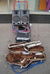 | Keywords: BuskingEquipment.JPG en The equipment of a professional busker that I was minding while he went to the toilet It seems to consist of from top to bottom trolley speakers amplifier and music player power source instrument saxophone and instrument case own Simon Speed 2013-02-02 Busking Photos by Simon Speed Taken with Nikon Coolpix S520 Tenor saxophones Cc-zero |