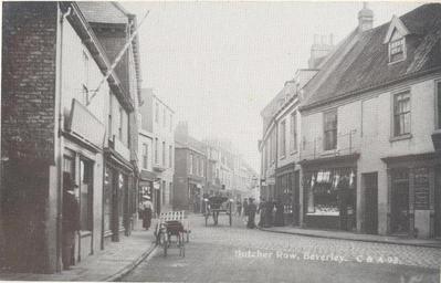 Keywords: Butcher Row Beverley c.1900 (archive ref DDX1075-1) (30094062676).jpg en Butcher Row circa 1900 <br> This image shows Butcher Row looking south eastwards from the end of Walkergate The street was known as Butcher Row from the 19th century and was originally part of the High Street which ran from Highgate to the North Bar It previously had many names one of which was Fishmarketgate after the fish market once situated in Wednesday Market <br> <br> <br> Why not try searching our <a href https //www flickr com/photos/erarchives/map > East Riding of Yorkshire Map</a> for more historic images <br> <a href https //www flickr com/photos/erarchives/map >www flickr com/photos/erarchives/map</a> <br> <br> Copyright We're happy for you to share this digital image within the spirit of Creative Commons <br> Please cite 'http //www2 eastriding gov uk/leisure/archives-family-and-local-history/ ' when reusing <br> Certain restrictions on high quality reproductions and commercial use of the original physical version apply If unsure please email archives service eastriding gov uk 2016-10-05 11 30 59 https //www flickr com/people/138361426 N08 East Riding Archives https //www flickr com/photos/erarchives/30094062676/ User Fæ/Flickr API Memories of Beverley historic streets beverley butcher row old photographs east riding people Location 53 841702 -0 427968 Cc-zero East Riding Archives https //flickr com/photos/138361426 N08/30094062676 2016-11-03 10 50 58 cc-zero beverley riding Photographs by East Riding Archives Photos uploaded from Flickr by Fæ using a script |