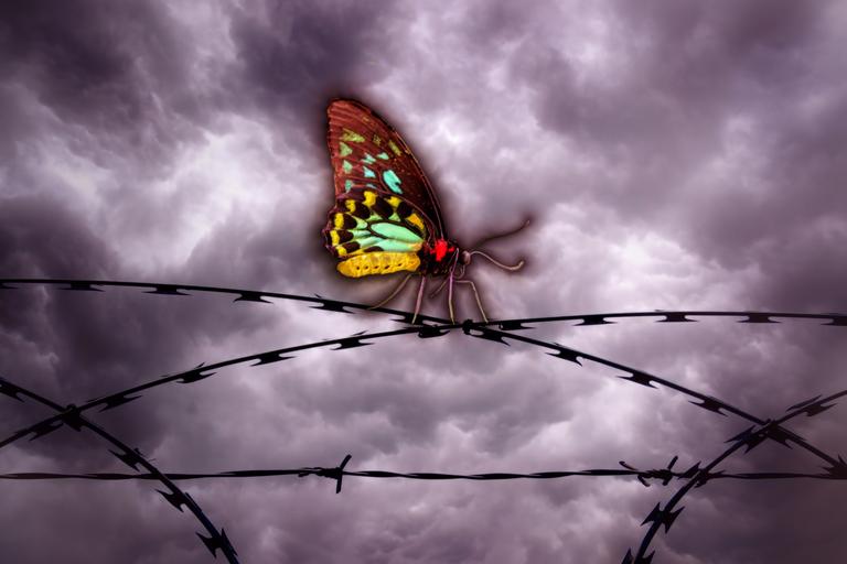 Keywords: butterfly barbed wire sky clouds freedom caught imprisoned fence demarcation fenced captivity