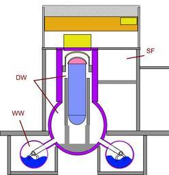 | Keywords: BWR Mark I Containment sketch primary.png en Rough sketch of a typical Boiling water reactor BWR Mark I Concrete Containment with Steel Torus including downcomers as used in the BWR/1 BWR/2 BWR/3 and some BWR/4 model reactors The primary containment is outlined in purple DW Drywell WW Wetwell SF Spent Fuel Pool light blue with pink dome Reactor Pressure Vessel purple Secondary Concrete Shield Wall fr Diagramme/coupe d'un réacteur à eau bouillante REB typique de type Mark I à enceinte de confinement en béton avec tore d'acier sous-jacent tel qu'utilisé dans les réacteurs de type REB/1 REB/2 REB/3 et certains REB/4 es Diagrama/corte esquemático de un reactor de agua en ebullición tipico del tipo Mark I con recinto de contención en hormigón con toro subyacente en acero como los utilizados en los reactores de tipo BWR/1 BWR/2 BWR/3 y algunos BWR/4 ca Esquema d'un reactor d'aigua en ebullició BWR Boiling water reactor de tipus Mark I amb contenció de formigó i torus d'acer incloent baixants com els utilitzats en els models de reactor BWR/1 BWR/2 BWR/3 i alguns BWR/4 DW Pou sec WW Pou moll SF Piscina del combustible gastat Sketched in Paint net using 826 x 852 canvas inspired by Page 15 pdf 40 Containment Integrity Research at Sandia National Laboratories - An Overview Manuscript completed March 2006 Published July 2006 id NUREG/CR-6906 and SAND2006-2274P http //www nrc gov/reading-rm/doc-collections/nuregs/contract/cr6906/cr6906 pdf - Prepared by Sandia National Laboratories for the U S Nuclear Regulatory Commission Job Code Y6757 The two diagrams on the same page are labeled Figure 5 Typical BWR Mark I Concrete Containment with Steel Torus User 84user 2011-04-04 <gallery>File BWR Mark I Containment diagram png original diagram from page 15 of the source File BWR Mark I Containment sketch png sketch without downcomers </gallery> technology ImageNote 2 329 273 96 321 826 852 2 reactor pressure vessel ImageNoteEnd 2 ImageNote 3 314 382 16 231 826 852 2 Cylindrical biological shield ImageNoteEnd 3 ImageNote 4 332 277 92 34 826 852 2 Top head assembly ImageNoteEnd 4 ImageNote 7 311 167 135 80 826 852 2 Drywell head and refueling assembly ImageNoteEnd 7 ImageNote 8 233 240 293 518 826 852 2 Inverted lightbulb drywell containment chamber ImageNoteEnd 8 ImageNote 9 208 34 474 199 826 852 2 Upper part of building housing crane and refueling assembly ImageNoteEnd 9 ImageNote 10 92 683 567 138 826 852 2 Wetwell torus holding the suppression pool of water to handle excess steam vented from the reactor above ImageNoteEnd 10 ImageNote 11 483 245 181 144 826 852 2 Spent fuel pool area highly simplified here ImageNoteEnd 11 ImageNote 12 216 78 458 74 826 852 2 Gantry crane ImageNoteEnd 12 ImageNote 13 554 740 69 57 826 852 2 Downcomer tubes duct the steam below the water surface so that it condenses thereby reducing the pressure ImageNoteEnd 13 Schemata of boiling water reactor |