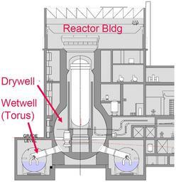 | Keywords: BWR Mark I Containment, diagram.png en Diagram of a typical Boiling water reactor BWR Mark I Concrete Containment with Steel Torus as used in the BWR/1 BWR/2 BWR/3 and some BWR/4 model reactors fr Diagrame/coupe d'un réacteur à eau bouillante REB typique de type Mark I à enceinte de confinement en béton avec tore d'acier sous-jacent tel qu'utilisé dans les réacteurs de type REB/1 REB/2 REB/3 et certains REB/4 Page 15 pdf 40 Containment Integrity Research at Sandia National Laboratories - An Overview Manuscript completed March 2006 Published July 2006 id NUREG/CR-6906 and SAND2006-2274P http //www nrc gov/reading-rm/doc-collections/nuregs/contract/cr6906/cr6906 pdf - Prepared by Sandia National Laboratories for the U S Nuclear Regulatory Commission Job Code Y6757 Sandia National Laboratories Source published July 2006 but this diagram may predate this <gallery> File BWR Mark I Containment sketch png Rough sketch inspired by this original File Reaktor svg Better diagram but at 90 degree rotation </gallery> The two diagrams on the same page are labeled Figure 5 Typical BWR Mark I Concrete Containment with Steel Torus The report text describing the diagrams on page 10 pdf 35 is BWR Mark I The Mark I is a pressure suppression containment Figure 5 which allows the containment to be smaller in volume The containment is divided into the drywell containing the reactor vessel and the wetwell torus containing the suppression pool The containments are constructed of either concrete or steel The water in the suppression pool acts as an energy absorbing medium in the event of an accident If a LOCA loss of coolant accident occurs steam flows from the drywell through a set of vent lines and downcomers into the suppression pool where the steam is condensed Steam can also be released from the reactor vessel through the safety relief valves and associated piping directly into the suppression pool In the event that the pressure in the wetwell exceeds the pressure in the drywell vacuum breakers are provided that equalize the pressure Mark I containments are equipped with lines connected to the wetwell that can be used to vent the containment if the pressure becomes too high PD-USGov ImageNote 1 226 222 306 529 826 852 2 Inverted lightbulb drywell containment chamber ImageNoteEnd 1 ImageNote 2 329 273 96 321 826 852 2 reactor pressure vessel ImageNoteEnd 2 ImageNote 3 314 382 16 231 826 852 2 Cylindrical biological shield ImageNoteEnd 3 ImageNote 4 332 277 92 34 826 852 2 Top head assembly ImageNoteEnd 4 ImageNote 5 274 158 204 94 826 852 2 Drywell head and refueling assembly ImageNoteEnd 5 ImageNote 6 215 94 462 67 826 852 2 Gantry crane ImageNoteEnd 6 Schemata of boiling water reactor |