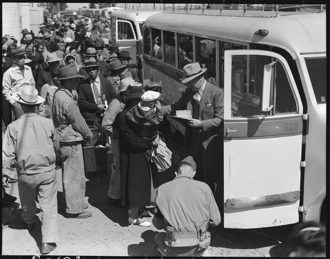 | Keywords: Byron, California. Farm families of Japanese ancestry boarding buses for Turlock Assembly Center 65 . . . - NARA - 537457.tif Scope and content The full caption for this photograph reads Byron California Farm families of Japanese ancestry boarding buses for Turlock Assembly Center 65 miles away An official of the Wartime Civil Control Administration is checking the families into the bus by number General notes 537457 Local identifier 210-G-C102 Department of the Interior War Relocation Authority 02/16/1944 - 06/30/1946 NARA-Author Lange Dorothea 1895-1965 Photographer 1372774 <br /> Still Picture Records Section Special Media Archives Services Division NWCS-S National Archives at College Park 8601 Adelphi Road College Park MD 20740-6001 1942-05-02 Record group Record Group 210 Records of the War Relocation Authority 1941 - 1989 Record group ARC 537 Central Photographic File of the War Relocation Authority compiled 1942 - 1945 Series ARC 536000 File unit File unit ARC Variant control numbers NAIL Control Number NWDNS-210-G-C102 yes Other versions <gallery> File Byron _California _Farm_families_of_Japanese_ancestry_boarding_buses_for_Turlock_Assembly_Center_65_ _ _ _-_NARA_-_537457 tif tif File Byron _California _Farm_families_of_Japanese_ancestry_boarding_buses_for_Turlock_Assembly_Center_65_ _ _ _-_NARA_-_537457 jpg jpg </gallery> NARA-cooperation PD-USGov Dorothea Lange Japanese American internment processing in Byron California NARA TIF images with categorized JPGs |