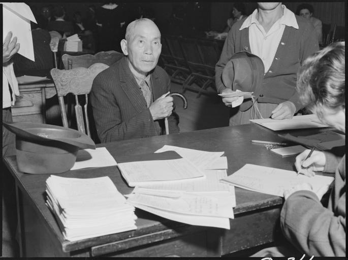 Keywords: Byron, California. This farmer of Japanese ancestry is being interviewed at the Wartime Civil Contr . . . - NARA - 537699.jpg Scope and content The full caption for this photograph reads Byron California This farmer of Japanese ancestry is being interviewed at the Wartime Civil Control Administration station three days before evacuation General notes 537699 Local identifier 210-G-C366 Department of the Interior War Relocation Authority 02/16/1944 - 06/30/1946 NARA-Author Lange Dorothea 1895-1965 Photographer 1372774 <br /> Still Picture Records Section Special Media Archives Services Division NWCS-S National Archives at College Park 8601 Adelphi Road College Park MD 20740-6001 1942-04-28 Record group Record Group 210 Records of the War Relocation Authority 1941 - 1989 Record group ARC 537 Central Photographic File of the War Relocation Authority compiled 1942 - 1945 Series ARC 536000 File unit File unit ARC Variant control numbers NAIL Control Number NWDNS-210-G-C366 Other versions <gallery> File Byron _California _This_farmer_of_Japanese_ancestry_is_being_interviewed_at_the_Wartime_Civil_Contr_ _ _ _-_NARA_-_537699 tif tif File Byron _California _This_farmer_of_Japanese_ancestry_is_being_interviewed_at_the_Wartime_Civil_Contr_ _ _ _-_NARA_-_537699 jpg jpg </gallery> NARA-cooperation PD-USGov Dorothea Lange Japanese American internment processing in Byron California |