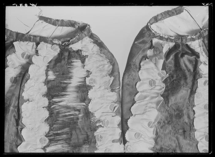 | Keywords: Byxor, "Bohemiens klädning" - Livrustkammaren - 27593.tif LSH artwork sv Knäbyxor av svart atlassiden Rynkade upptill bak och fram på sidorna Smal byxlucka fram bredd 260 mm som knäppes i sidorna med en knapp på vardera sidan Knappar av trä klädda med svart siden diameter 22 mm Knäppning fram innanför luckan med tre knappar av trä klädda i svart siden Sprund upptill mitt bak längd 160 mm med två tränsade hål på varje sida samt en kort och en längre spänntamp med knapphål Knapphålet på den längre är endast uppklippt inte tränsat <br/>Benen rynkade i nederkant samt har sprund i nederkanternas yttersidor längd 150 mm <br/>Längsgående randig dekor i form av vågklippta veckade band i rosa siden atlas enligt gula liggaren taft med spridda silverpaljetter <br/>Foder i ljust linne tuskaft <br/>Gåva tillsammans med gnr 17/46-17/192 av H M Konungen Gustav V genom chefen för Kungliga Husgerådskammaren original caption end other date century 18 silk Färg svart d1 - dräkt - yttermaterial material sidenatlas - wood d5 - dräkt - knappar och spännen material trä - silk Färg svart d5 - dräkt - knappar och spännen material sidenatlas - silk Färg rosa d4 - dräkt - passpoaler band kantning uppslag material siden - sequins Färg silver d4 - dräkt - passpoaler band kantning uppslag material paljetter - linen Färg benvit d2 - dräkt - foder material linne size mm 825 size mm 620 size mm 305 ben nedtill g 759 LRK place of origin original filename LN_B16223_019103 58029 inventory number LRK 21502 27593 CC0 Byxor Bohemiens klädning - Livrustkammaren - 27593-negative tif <gallery caption Different images of same object > File Byxor Bohemiens klädning - Livrustkammaren - 1883 tif File Byxor Bohemiens klädning - Livrustkammaren - 78928 tif File Byxor Bohemiens klädning - Livrustkammaren - 70369 tif </gallery> Trousers Media contributed by LSH dim-with multiple size templates Media contributed by LSH 2014-11 |